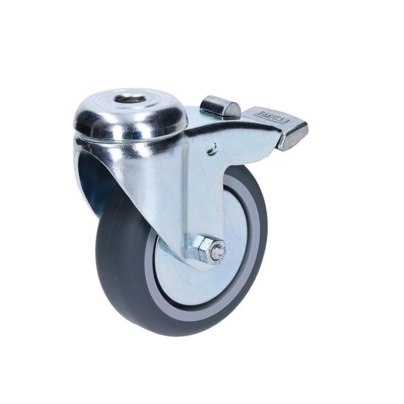 Otočné koliesko, vidlica vyrobená z oceľového výlisku - zinkovaná. Dvojitá guľôčková dráha v hlave otoče. Stredový otvor na čap priemeru 11mm. Stred kolieska vyrobený z polypropylénu, behúň kolieska z termoplatickej gumy - TENTEPRÉN. Klzné uloženie.