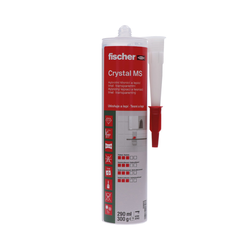 Transparentný fischer Crystal MS je dokonale vhodný na trvalé elastické tesnenie a lepenie na viditeľných miestach, najmä transparentných materiálov, ako je sklo. Izolačné materiály, lišty, panely a obklady možno bezpečne utesniť a zlepiť. Vďaka vysokej počiatočnej priľnavosti nie je vo väčšine prípadov potrebná predbežná fixácia. Vďaka vlastnostiam kompenzácie ťahu sa môže používať v exteriéri aj na prírodný kameň a vlhké podklady.