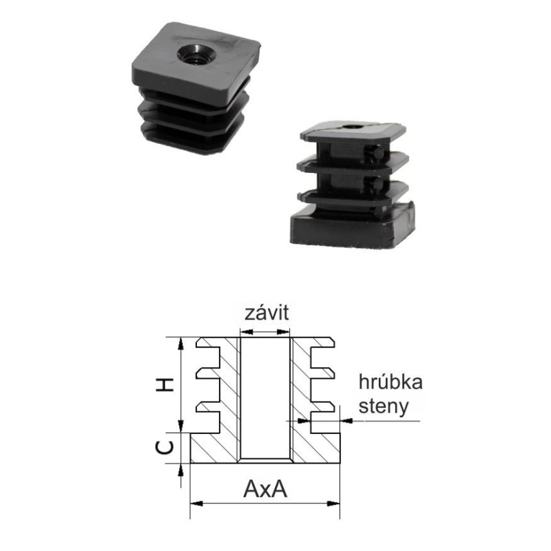 M8,A-20mm,H-20mm,C-6.2mm,čierna, Hrúbka steny 1-1.25mm,Plastová štvorcovo-rúrková zátka zo závitom PE