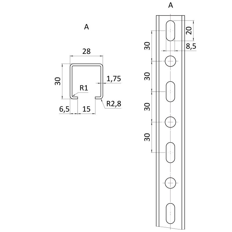 Dierovaný montážny C profil, 28x30x1.75, L-3m, pozinkovaný