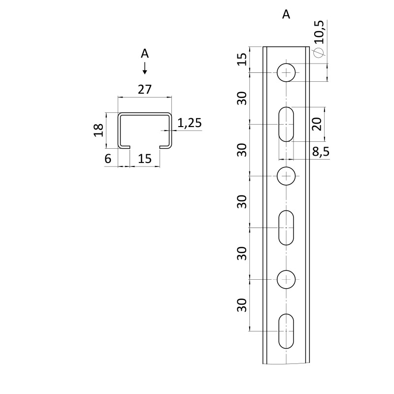Dierovaný montážny C profil, 27x18x1.25, L-3m, pozinkovaný