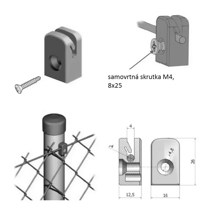 úchytka napínacieho drôtu so samovrtnou skrutkou M4, 8x25mm, čierna RAL9005