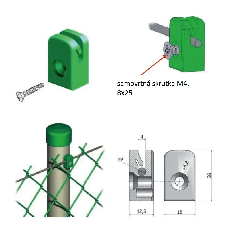 úchytka napínacieho drôtu so samovrtnou skrutkou M4, 8x25mm, zelená RAL6005
