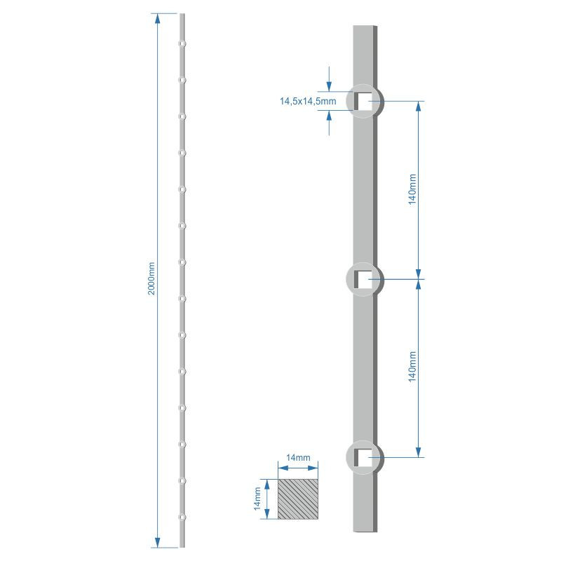 prebíjaná tyč H 2000mm opieskovaná, profil 14x14mm, rozteč dier 140mm, oko 14,5x14,5mm - 14ks