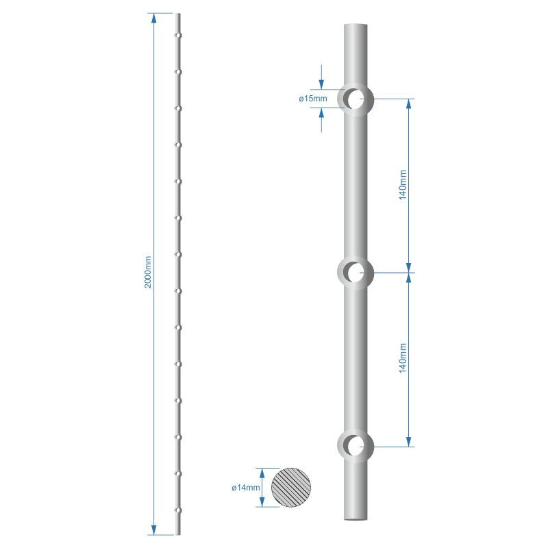 Prebíjaná tyč H 2000mm opieskovaná, profil ø14mm, rozteč dier 140mm, oko ø15mm - 14ks