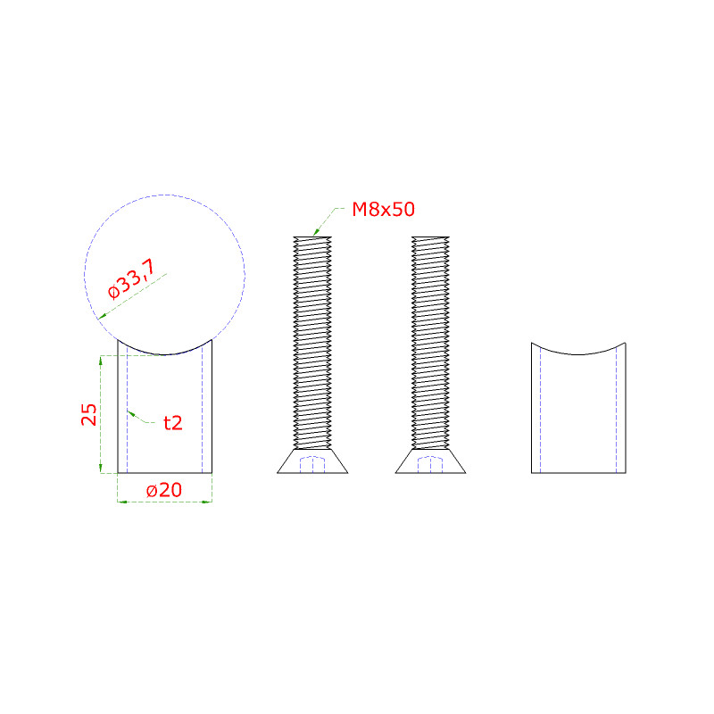 Prechod na vymedzenie vzdialenosti medzi stĺpom ø 33.7mm a kotviacou platňou, ø 20x2.0mm /L:25mm, vnút. skrutka: M8x50mm, brúsená nerez K320 /AISI304, bal: 2ks