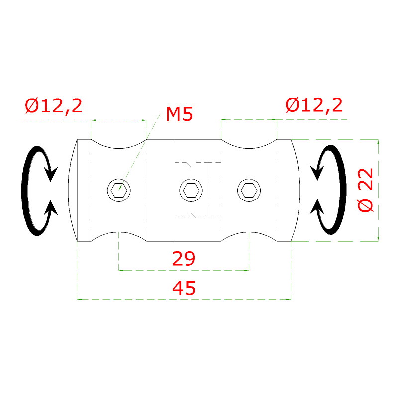 držiak tyčí ø 12/12mm prechodný-otočný (45x22mm), brúsená nerez K320 /AISI304