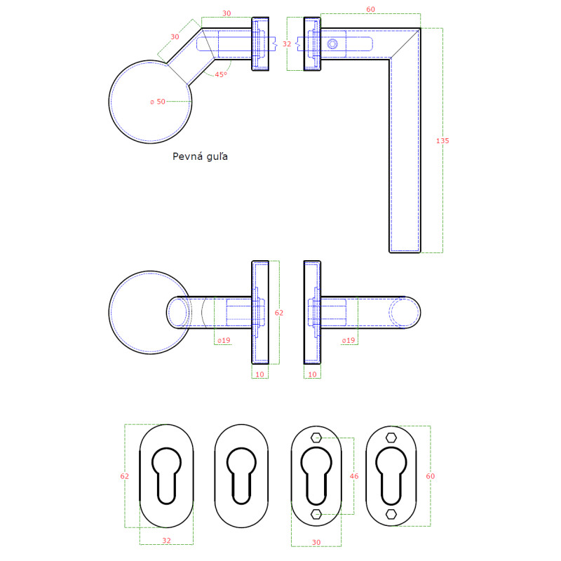 1ks kľučka (ľavá), 1ks guľa, 2ks dolná oválna rozeta