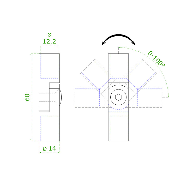 spoj nastaviteľný ø 12mm (0-100°) s kĺbom, leštená nerez /AISI304