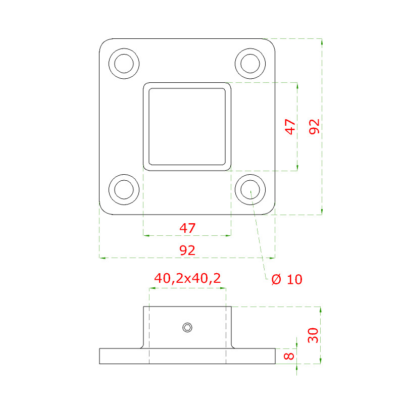 Príruba spodná (92x92mm) na jokel 40x40mm, brúsená nerez K320 /AISI304
