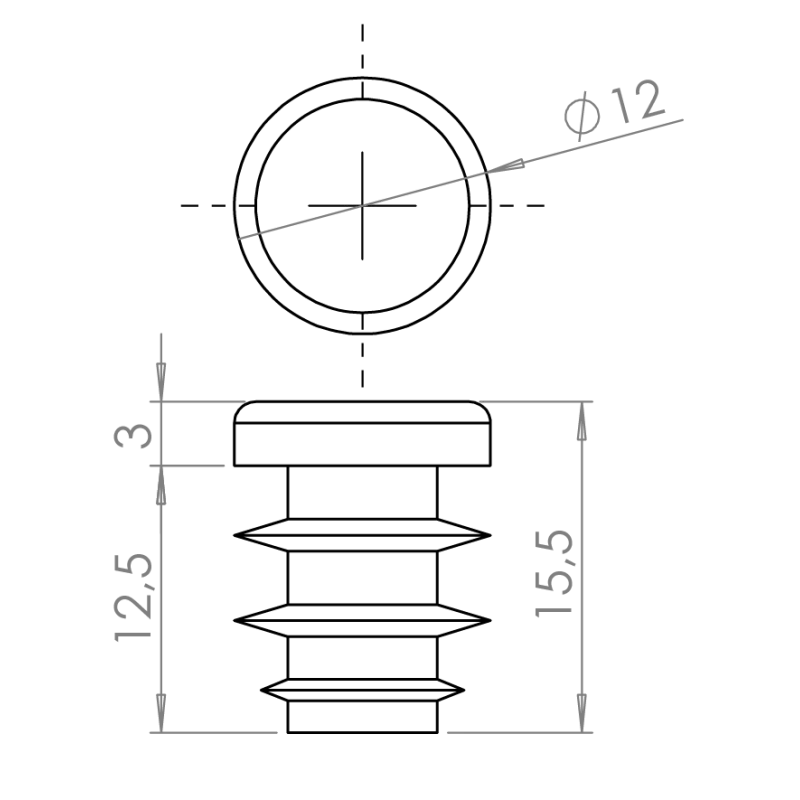 vnútorná krytka guľatá D-12mm plastová, šedá