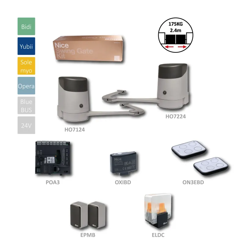 HOPPBDKCE sada ramenových pohonov pre dvojkrídlovú bránu do 2,4m/krídlo, 1x HO7124 s POA3, 1x HO7224, 2x ON3EBD, 1x OXIBD, 1 pár EPMB, 1x ELDC