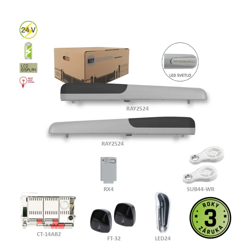 900KRAY2524ER - RAYKIT pro dvojkrídlovú bránu do 2,5m/krídlo., 2x RAY2524 pohon 24V, 85W, 1500N, 1x LED24, 2x SUB-44WR, 1x CT-14A, 1x RX4, 1 pár FT-32