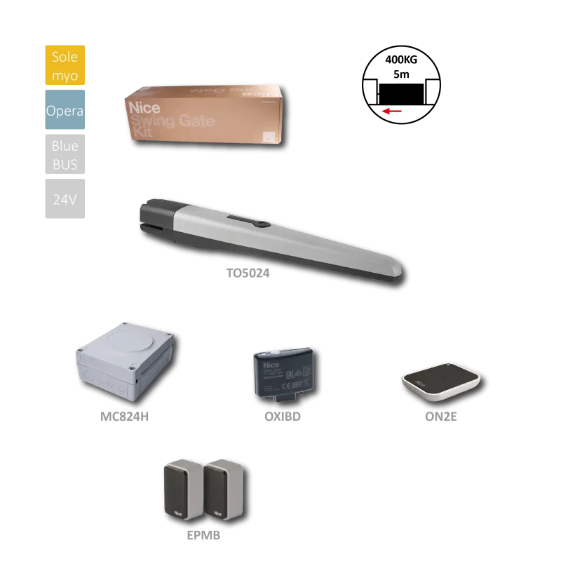 sada pre jednokrídlovú bránu do 5m/krídlo, 1x TO5024 (24V, 120W, 1800N), 1x MC824H, 1x ON2E, 1x OXI, 1 pár EPMB