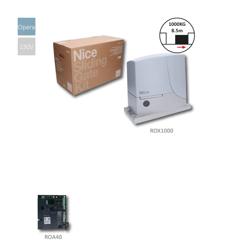 Sada pre posuvnú bránu do 1000kg, 1x ROX1000 (230V, 350W, 670N), 1x ROA40 so zabudovaným prijímačom