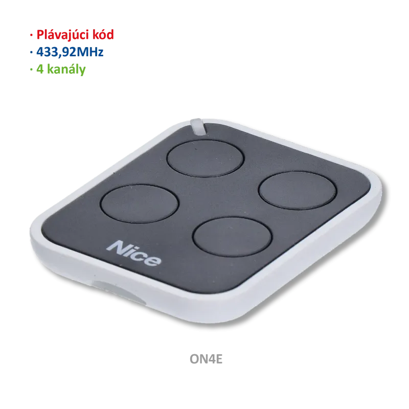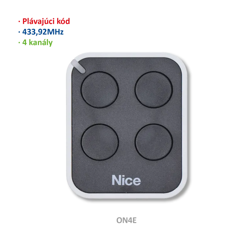 433,92 MHz plávajúci kód, správa Povoľovacích kódov a Certifikátov, samonačítanie a zabudovaný čítač zblízka; s kódovaním 0-Code 72 Bit, kompatibilný aj s prijímačmi s kódovaním Nice FloR.