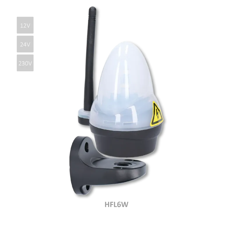 Biele výstražné LED svetlo s anténou, 12/24/230V, AC/DC, držiak pre bočné uchytenie, rozmer 47x38x210mm, svietivosť 739 lux
