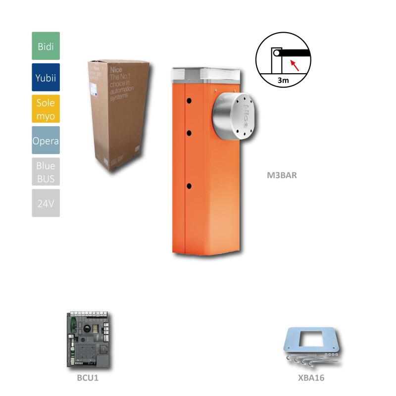 M3BAR automatická závora do 3m prejazdu (24V, 150W, 100Nm) riadiaca jednotka BCU1, 1x montážna doska XBA16, bez ramena