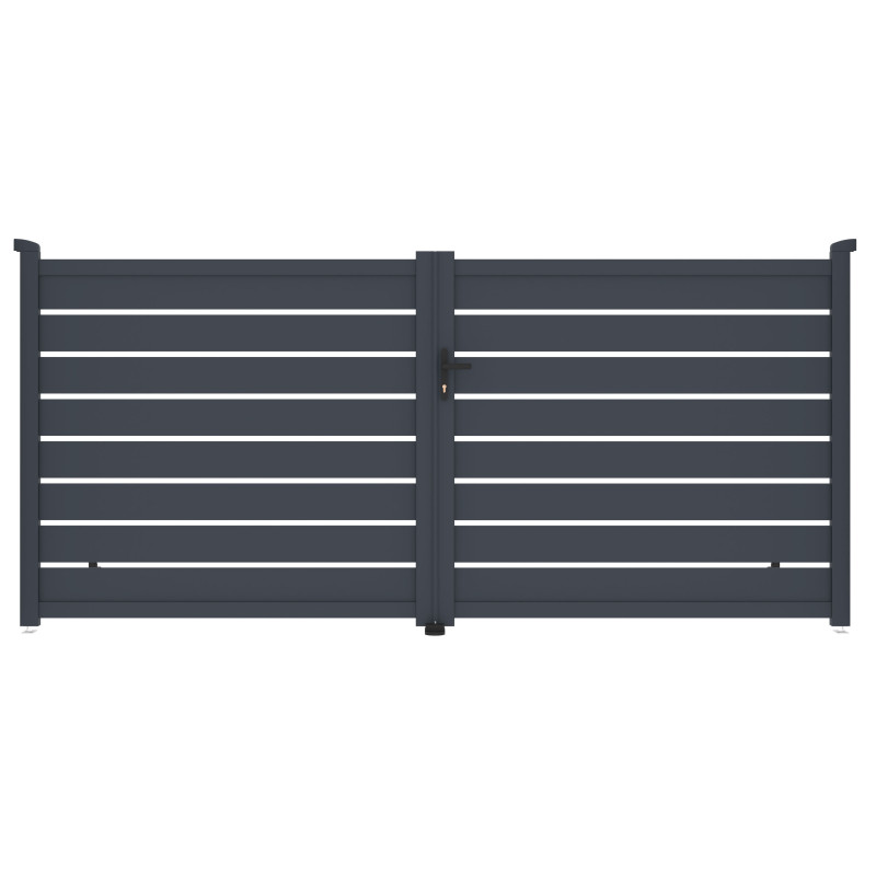 Túto dvojkrídlovú vjazdovú bránu vyrábame z ľahkého, pevného a hlavne bezúdržbového hliníka. Materiál je odolný voči prasknutiu aj prehnutiu, nezhrdzavie a elegantný antracitový (alebo iný dostupný) odtieň, nanesený práškovým lakovaním, dodáva bráne atraktivitu a zaručuje stálofarebnosť. Zosilnený profil tejto dvojkrídlovej vjazdovej brány vám navyše v budúcnosti umožní jednoduchú montáž elektrického otvárania.