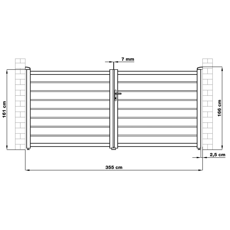 Vjazdová brána je dôležitou súčasťou oplotenia vašej nehnuteľnosti. Táto 158 cm vysoká hliníková brána ponúka vďaka kvalitnému práškovému nástreku výnimočnú životnosť, je odolná, atraktívna a jej šírku môžete jednoducho prispôsobiť existujúcemu oploteniu. Otváranie je riešené kľučkou a zámkom s FAB vložkou. Šírka 350 cm umožní hladký prejazd všetkých vozidiel.