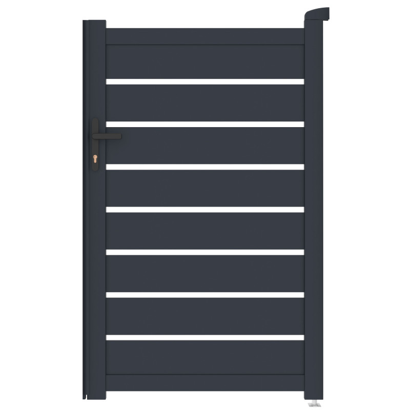 Výplň s moderními horizontálně uloženými lamelami v atraktivním grafitovém provedení kombinuje dostatek soukromí s nadčasovým designem. Branka s otevíráním dovnitř (nebo ven, dle preferencí montáže) tak bude slušet každému typu oplocené stavby a podtrhne její celkový vzhled.