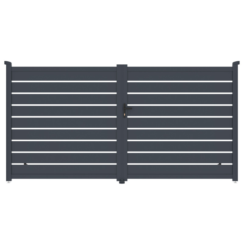 Túto dvojkrídlovú vjazdovú bránu vyrábame z ľahkého, pevného a hlavne bezúdržbového hliníka. Materiál je odolný voči prasknutiu aj prehnutiu, nezhrdzavie a elegantný antracitový (alebo iný dostupný) odtieň, nanesený práškovým lakovaním, dodáva bráne atraktivitu a zaručuje stálofarebnosť. Zosilnený profil tejto dvojkrídlovej vjazdovej brány vám navyše v budúcnosti umožní jednoduchú montáž elektrického otvárania.