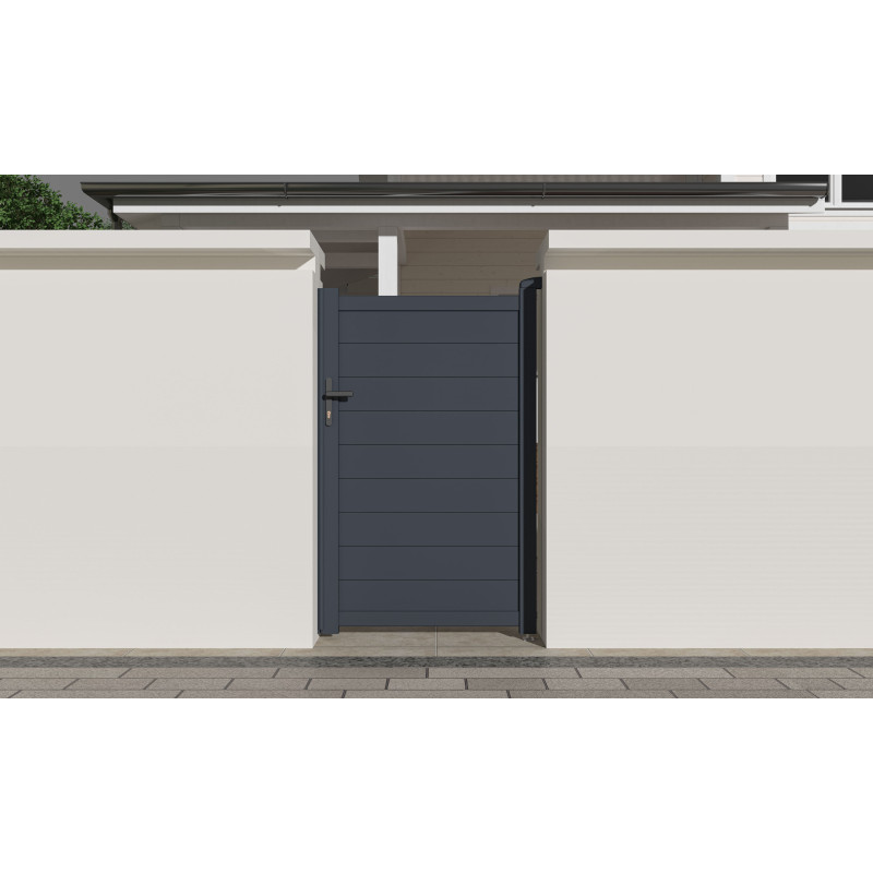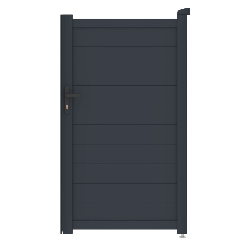 Výplň s modernými horizontálne uloženými lamelami v atraktívnom grafitovom (alebo inom dostupnom) prevedení kombinuje dostatok súkromia s nadčasovým dizajnom. Bránka s otváraním dovnútra (alebo von, podľa preferencií montáže) tak pristane každému typu oplotenej stavby a podčiarkne jej celkový vzhľad.