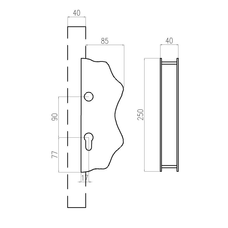 Kazetová zostava pre bránku 250x95x40mm, otvor pre kľučku ø 19,5mm, na profil 40x40mm, hladká, pre zámok ZM90/80