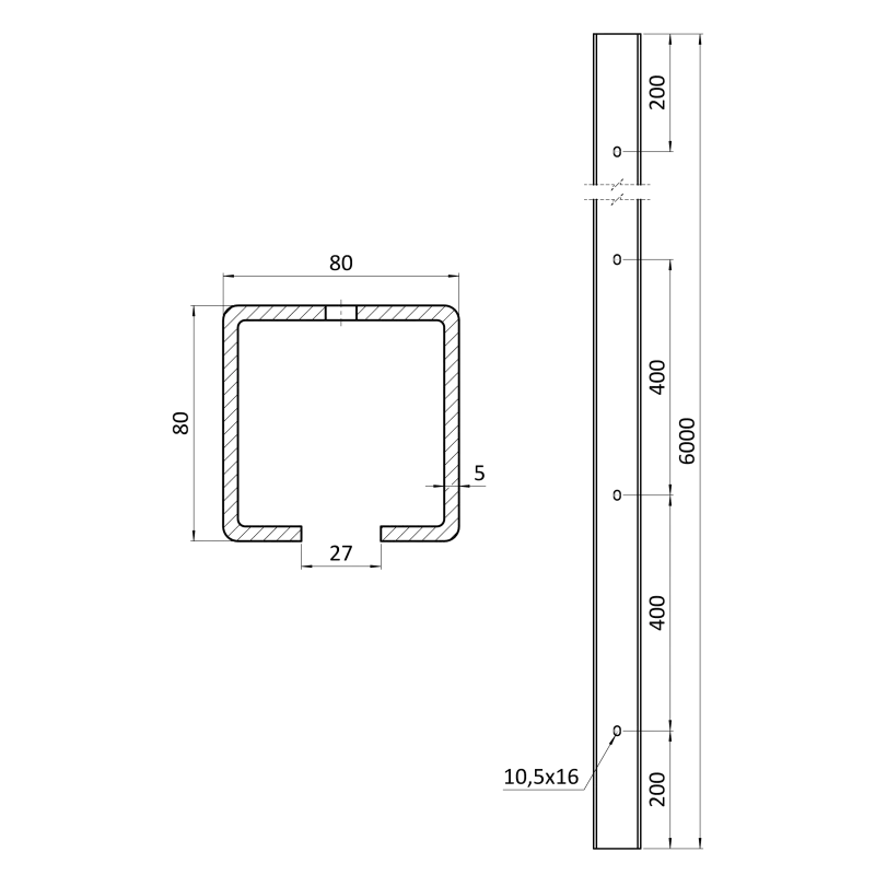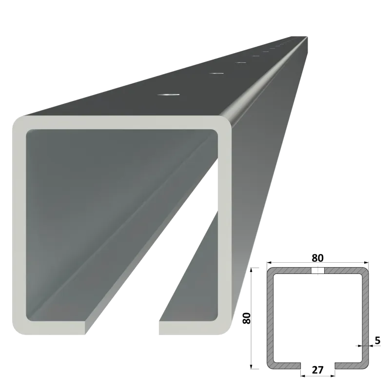 C profil 80x80x5mm s otvormi, pozinkovaný pre samonosný systém posuvnej brány