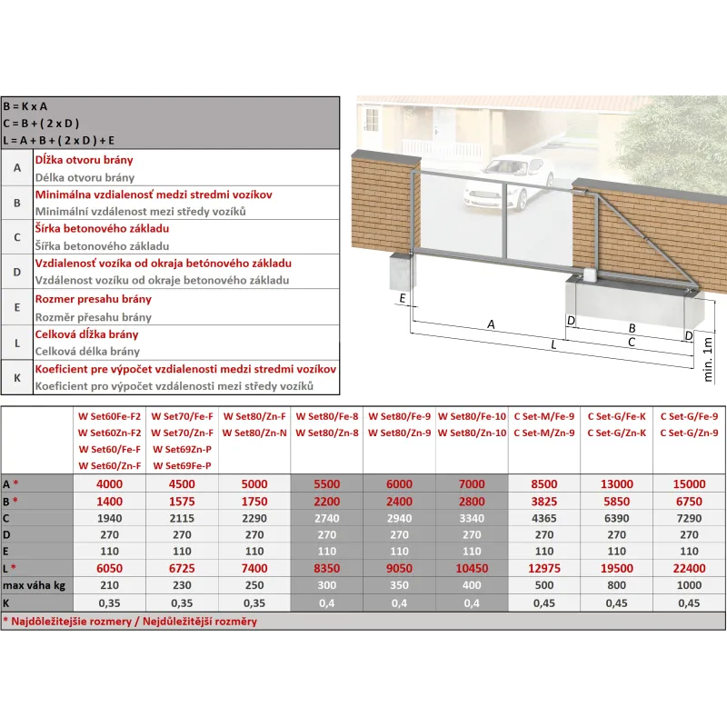Pri nákupe balenia setu samonosného systému upozorňujeme, že celková dĺžka brány L uvedená v tabuľke, sa líši od celkovej dĺžky samonosného C profilu v balení setu.