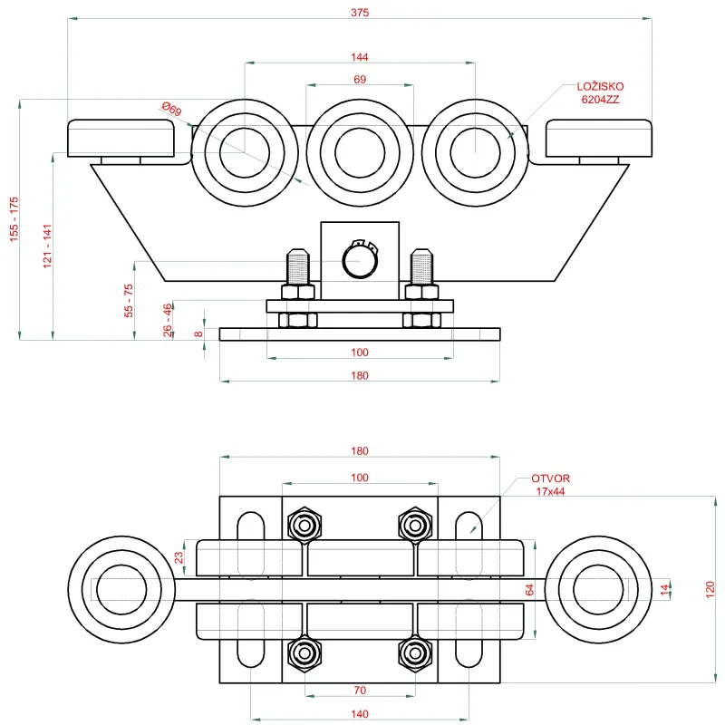 Vozík regulovateľný pre C-profil 80x80x5mm, polyamidové kolieska 8ks, žltý zinok, pre bránu do 400kg otvor do 5,5 m