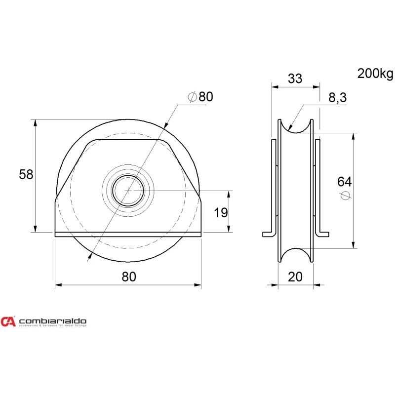 Vodiace koliesko ø 80mm na privarenie Combi Arialdo, pre profil C902/16, nosnosť 200kg