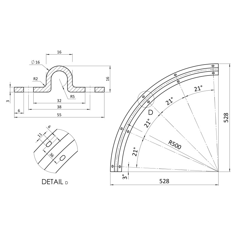 Vodiaci profil pre brány, U ø16mm profil, polomer 0.5m, zakrivenie 90 stupňov
