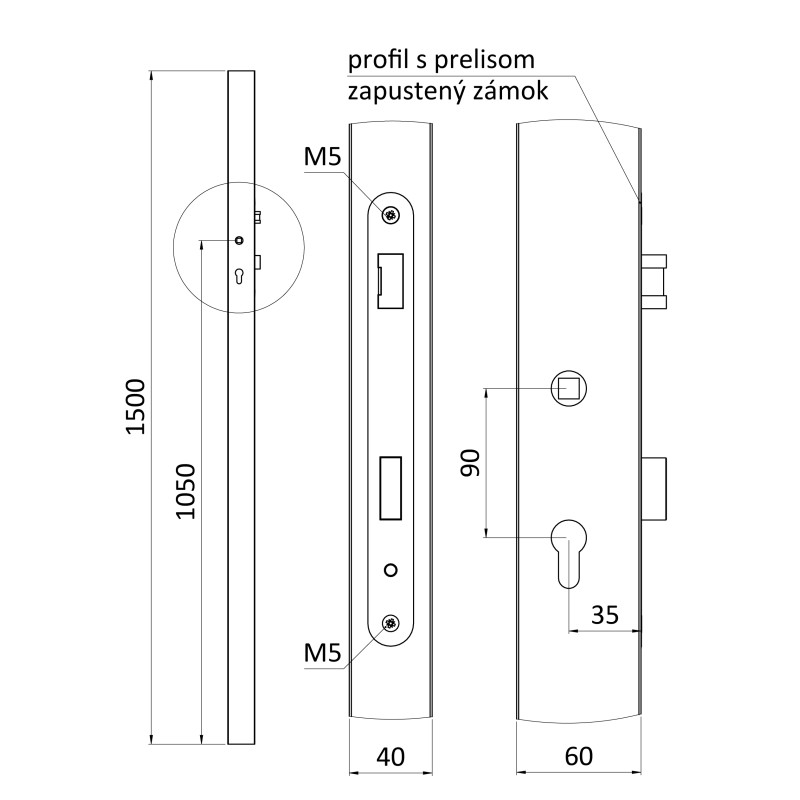 Profil 60 x 40 x 1,5 mm H = 1500 mm so zapusteným zámkom, vhodný pre rám bránky, bez povrchovej úpravy.