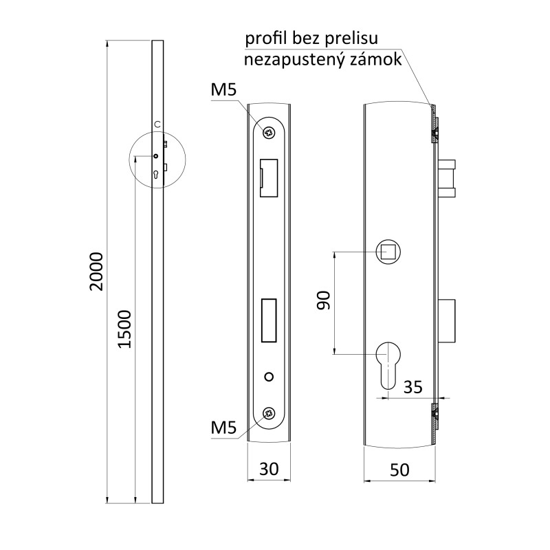 Profil 50 x 30 x 1,5 mm H = 2000 mm so zapusteným zámkom, vhodný pre rám bránky, bez povrchovej úpravy, zámok nemá prelisovaný profil pre zapustenie.