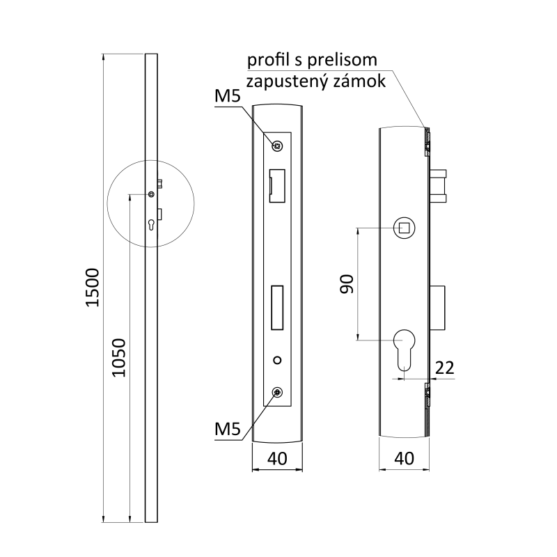 Profil 40 x 40 x 1,5 mm H = 1500 mm so zapusteným zámkom, vhodný pre rám bránky, bez povrchovej úpravy.