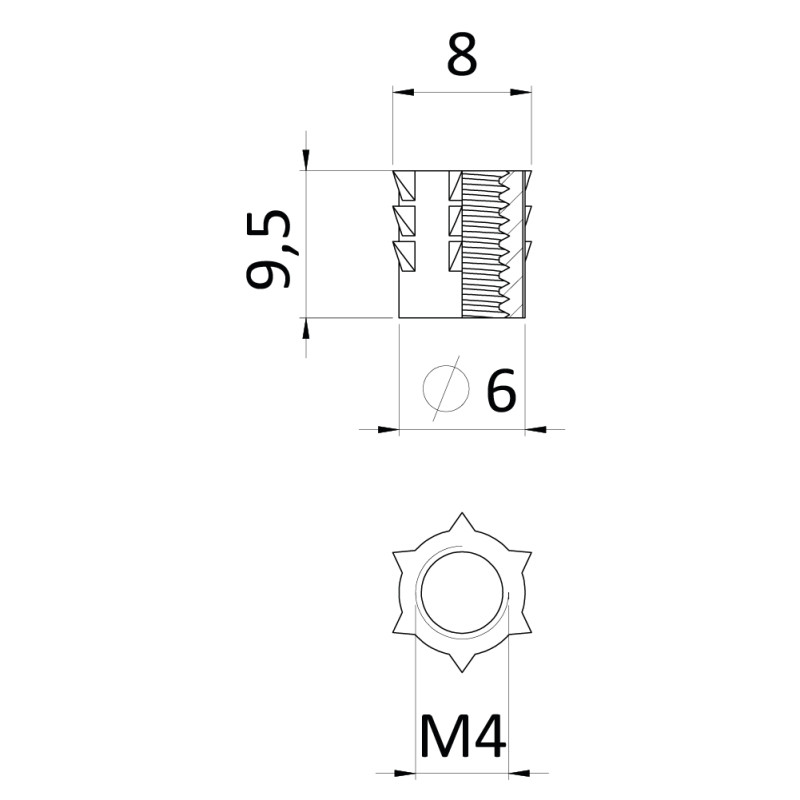 Narážacia matica do dreva M4x9.5 s vnútorným metrickým závitom, zinková zliatina