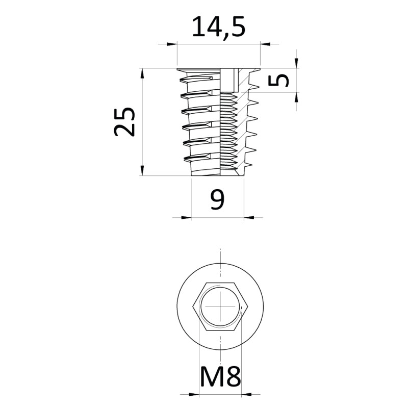Závrtná matica M8x25 s vnútorným metrickým závitom a imbus šesťhranom, zinková zliatina