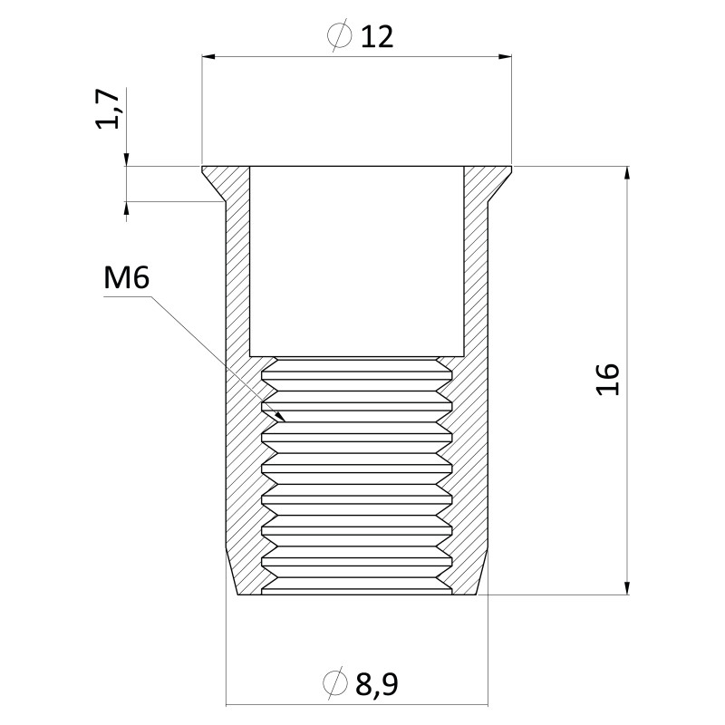 Nerezová nitovacia matica M6, zapustená hlava, ryhovaný driek, AISI304