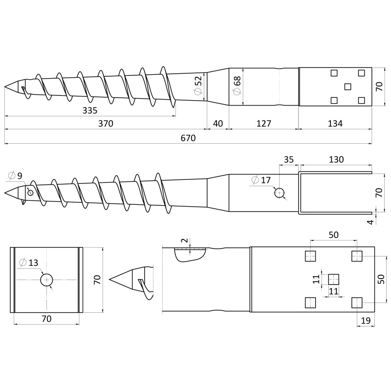 Zemný vrut, pätka U, 70 x 70 mm, žiarový pozink