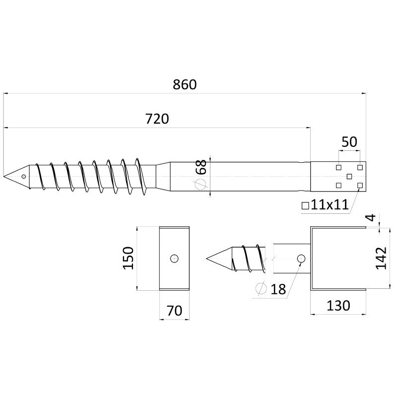 Zemný vrut, pätka U, 140 x 140 mm, žiarový pozink