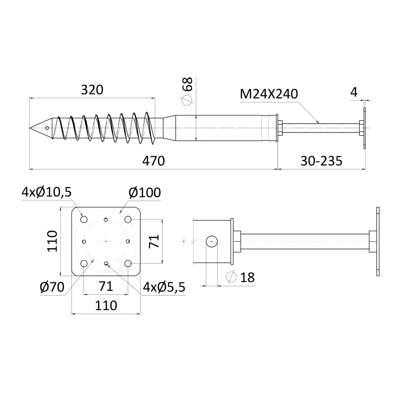 Zemný vrut, pätka M24, 110 x 110 mm, zinková farba