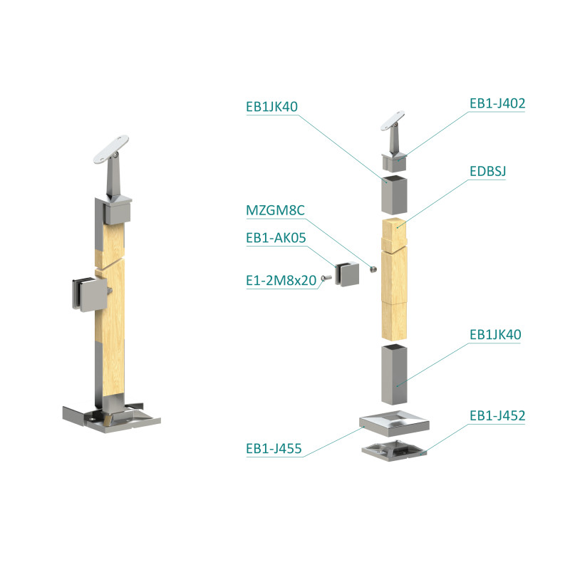 Drevený stĺp, vrchné kotvenie, výplň: sklo, ľavý