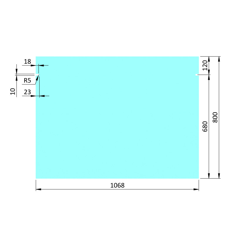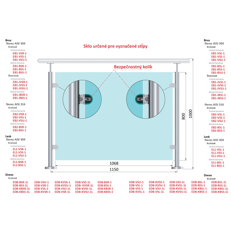Transparentné ESG / VSG sklo pre osovú vzdialenosť medzi stĺpikmi 1150mm, rozmer 1068x800mm, hrúbka: 8.76mm s fóliou a výrezmi pre bezpečnostný kolík