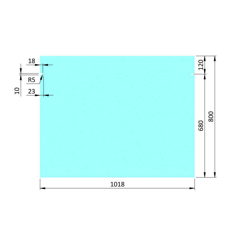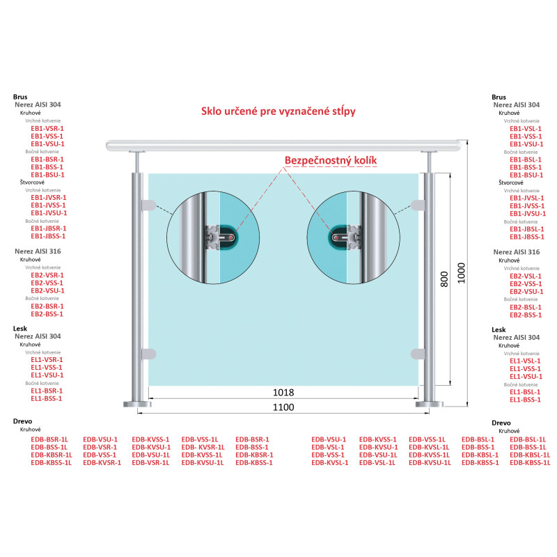 Transparentné ESG / VSG sklo pre osovú vzdialenosť medzi stĺpikmi 1100mm, rozmer 1018x800mm, hrúbka: 8.76mm s fóliou a výrezmi pre bezpečnostný kolík